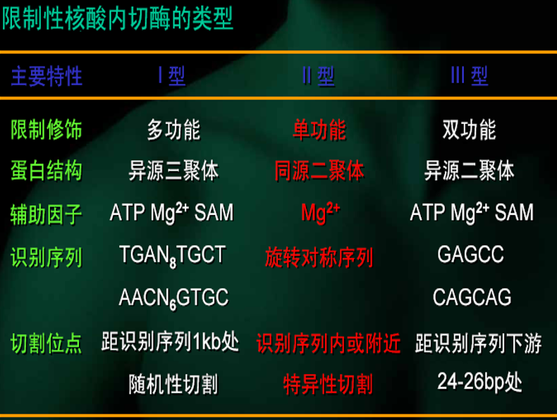 Ⅰ型酶: 分子量较大,反应需Mg2+、S-腺苷甲硫氨酸(SAM)、ATP等。这类酶有特异的识别位点但没有特异的切割位点,而且切割是随机的,所以在基因工程中应用不大。