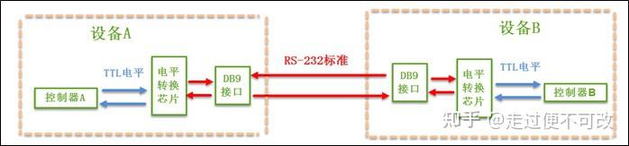 在上面的通讯方式中,两个通讯设备的"DB9接口"之间通过串口信号线建立起连接,串口信号线中使用"RS-232标准"传输数据信号。由于RS-232电平标准的信号不能直接被控制器直接识别,所以这些信号会经过一个"电平转换芯片"转换成控制器能识别的"TTL校准"的电平信号,才能实现通讯。
