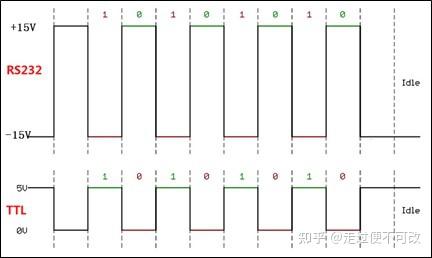 我们知道常见的电子电路中常使用TTL的电平标准,理想状态下,使用5V表示二进制逻辑1,使用0V表示逻辑0;而为了增加串口通讯的远距离传输及抗干扰能力,它使用-15V表示逻辑1,+15V表示逻辑0。使用RS232与TTL电平校准表示同一个信号时的对比见图 202。