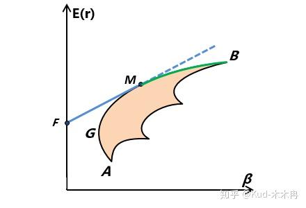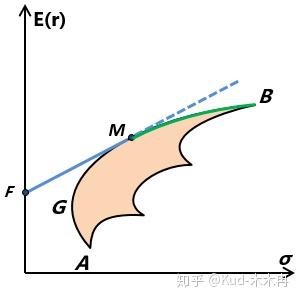 所有可能的组合形成一个区域。同样,我们可以找到全局最小方差组合G,则G以上的边沿就是其有效前沿。
